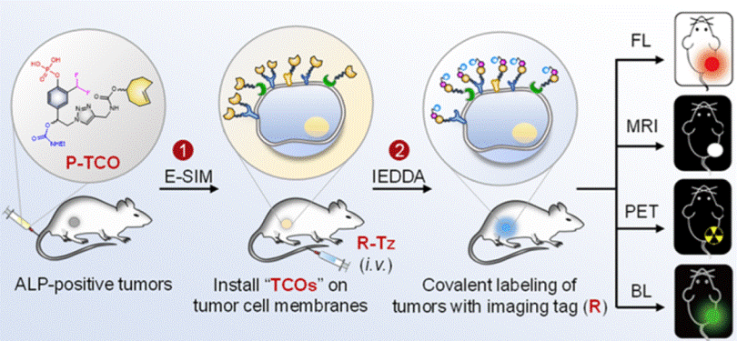 此外,谢贺新教授课题组与南京大学叶德举教授团队、江苏省原子医学研究所林建国研究员团队合作,在预靶向多模态活体动物肿瘤成像取得最新进展,相关成果以“Pretargeted Multimodal Tumor Imaging by Enzymatic Self-Immobilization Labeling and Bioorthogonal Reaction”为题发表在Journal of the American Chemical Society。该研究以研究团队前期发展的碱性磷酸酶自锚定探针(Chem. Eur. J. 2019, 25, 13994)为预靶向基团,通过亚甲基苯醌中间体的形成将反式环辛烯(TCO)选择性共价标记在活体动物肿瘤细胞膜上,进而通过快速的生物正交反应,将含有四嗪的各种信号报告基团(如荧光染料、磁纳米粒子、放射性核素、生物发光蛋白等)选择性富集在肿瘤细胞中,从而实现对活体小鼠肿瘤的高灵敏荧光、核磁共振、正电子发射断层及生物发光等多模态成像。南京大学博士研究生缪银杏、副研究员王宇琦、华东理工大学博士研究生陈叶锋为论文共同第一作者,谢贺新、林建国和叶德举为论文共同通讯作者。